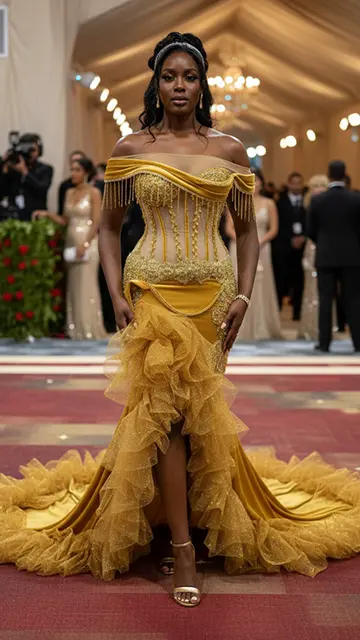 • Statement Corset Bodice: The structured, figure-hugging bodice is the centerpiece, providing a flattering, hourglass silhouette. It features sheer paneling, visible boning, and meticulous gold beading and fringe details that offer a captivating sparkle.
