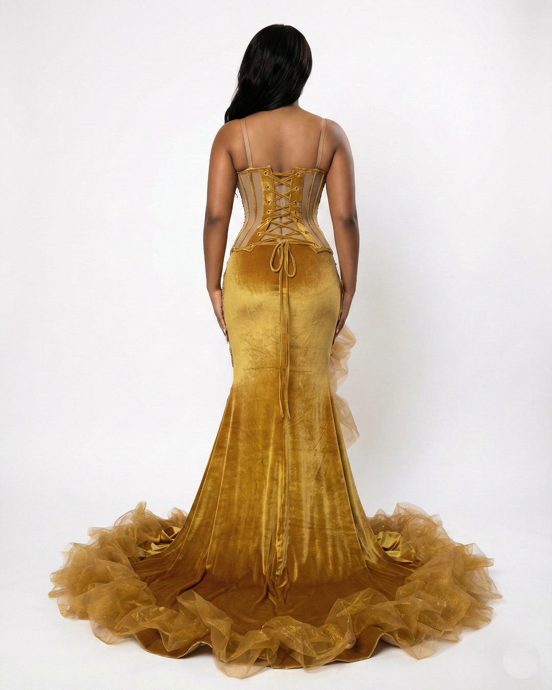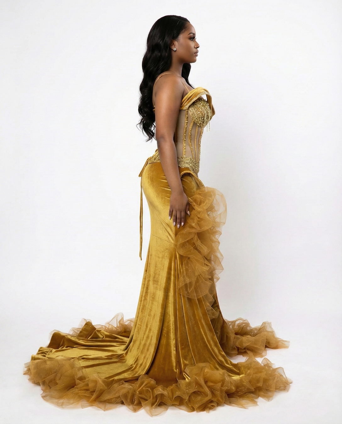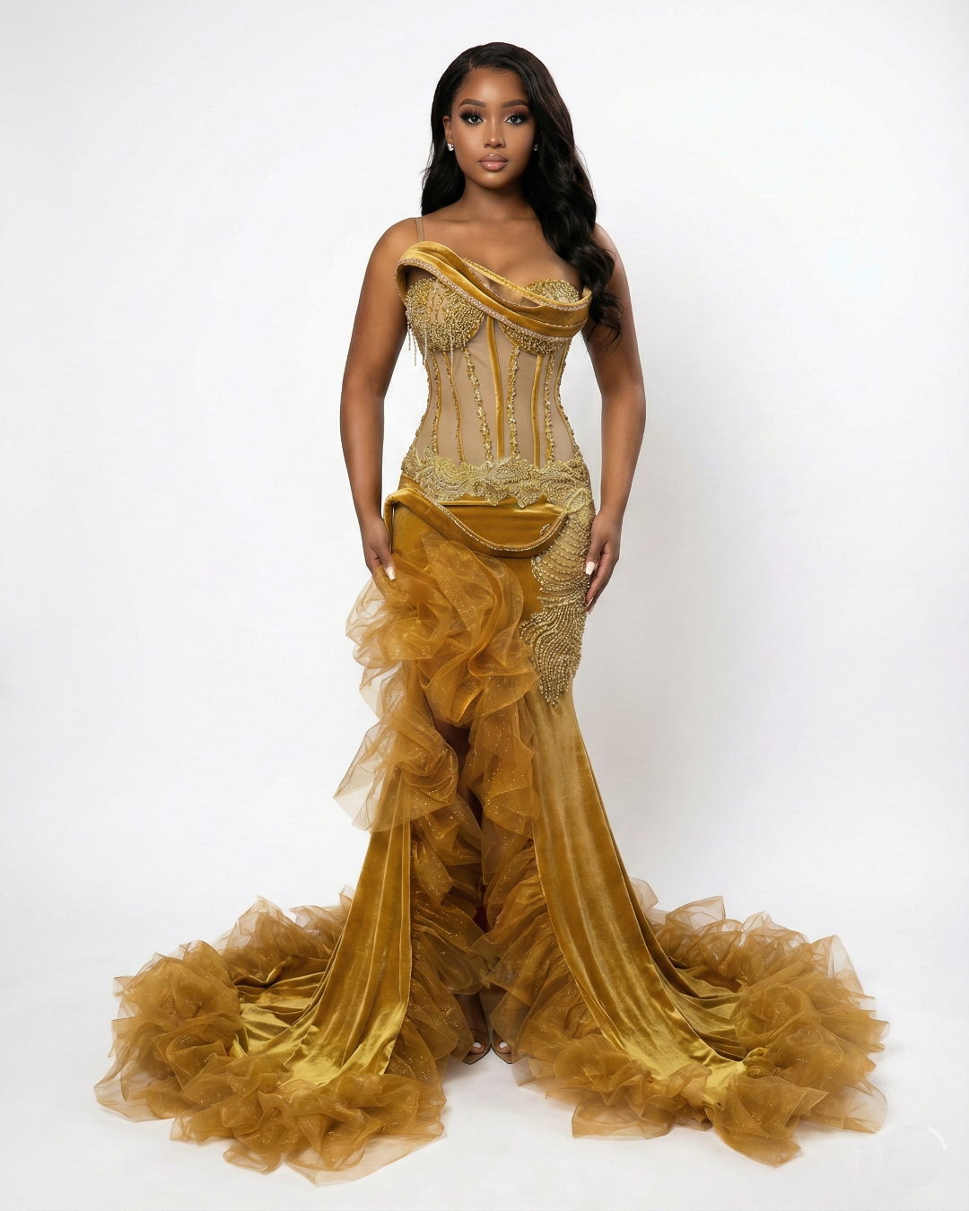 • Dramatic Ruffle Skirt: The rich mustard yellow/gold velvet fabric transitions into a voluminous, layered tulle and ruffle skirt. The shimmering, gathered ruffles create the dramatic mermaid/trumpet silhouette that is perfect for photos and the dance floor.