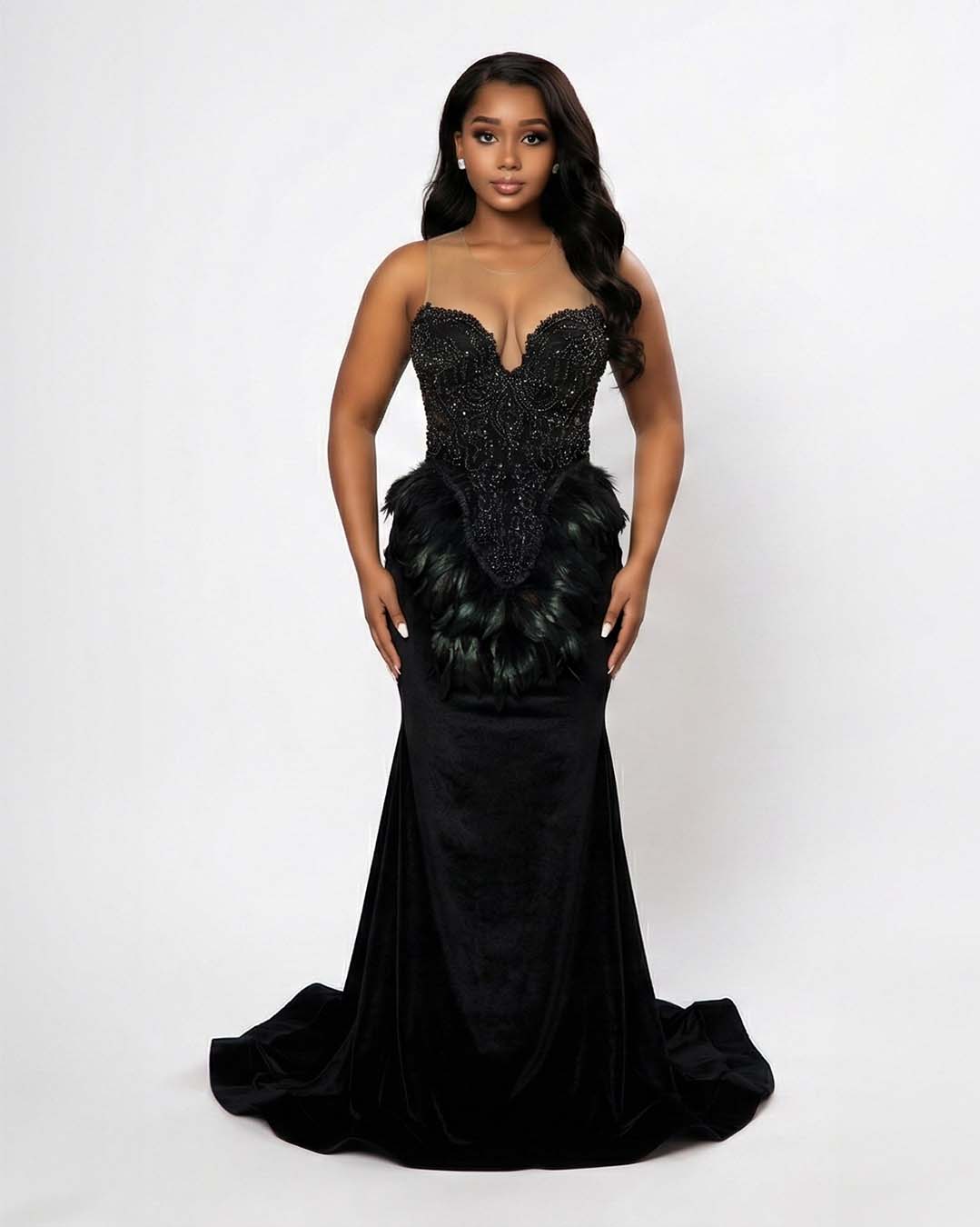 Dramatic Feather Accents: A fringe of real feather accents wraps around the hips, adding texture, movement, and a touch of couture luxury to the silhouette.
