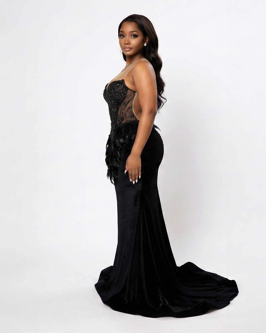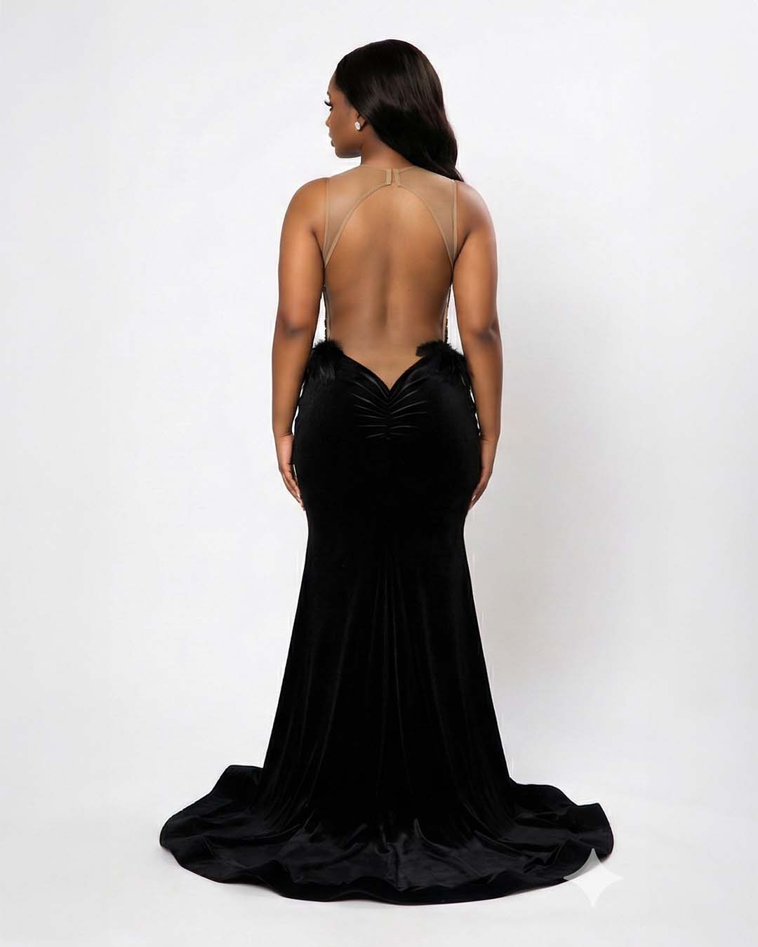 Luxe Velvet & Mesh: The skirt is crafted from rich, stretch velvet that hugs your curves and pools beautifully at the floor, while the bodice features a sheer illusion mesh overlay for a daring, skin-baring look that still offers support.